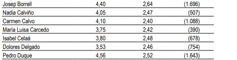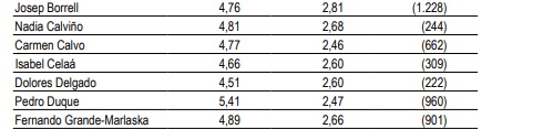 Con respecto a los sondeos de julio, los ministros no salen reforzados en cuanto a la opinión positiva de los encuestados. Duque muestra una caída sustancial pasando de 5,41 puntos de apoyo a 4,56 este mes, pese a ello se mantiene como el más apreciado. El mismo caso ocurre con Borrell, aunque este presenta un menor descenso en la tabla.