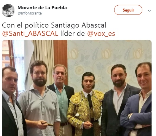 El mes pasado, el torero Morante de la Puebla acudió al acto en Vistalegre de VOX, al que asistieron 9.000 simpatizantes. Ahora, Morante da un paso más y junto con Del Castillo mostrará su defensa a la formación de Abascal. Precisamente, el torero mostró en su cuenta personal de Twitter su simpatía hacia el líder de VOX.