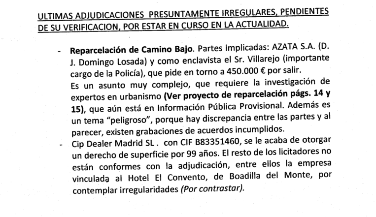 En este documento se enumeraron unas adjudicaciones presuntamente irregulares, pendientes de verificar y que estaban en curso en ese momento. Entre ellas aparecían unos cambios urbanísticos que afectaban a José Manuel Villarejo. Según el informe, el comisario, al que identificó por su apellido y como “importante cargo de la Policía”, era un propietario afectado por la reparcelación de una zona, que pedía “en torno a 450.000 euros por salir”.