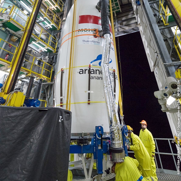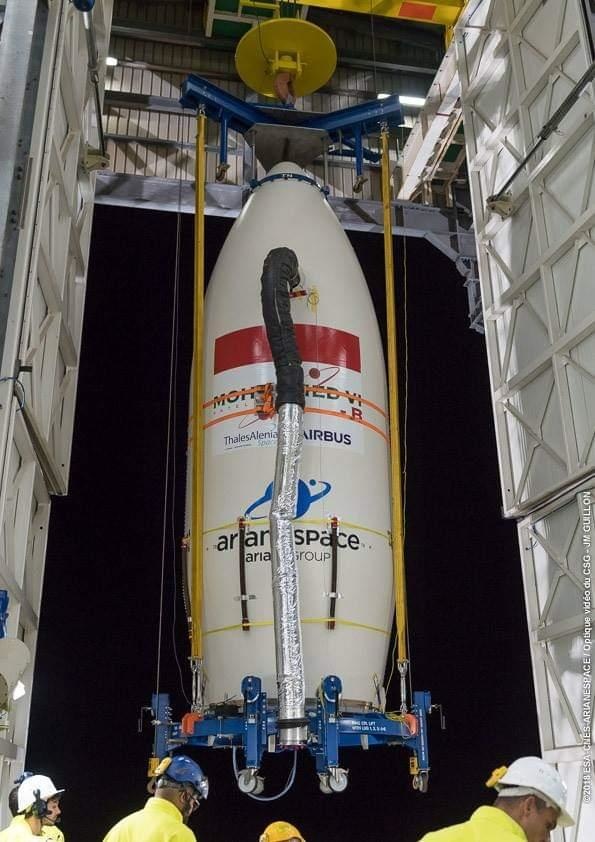 El nuevo espía electro-óptico marroquí está alojado en la parte alta del cohete Vega ‒de 29,9 metros de altura, 3 metros de diámetro y un peso al despegue de 137 toneladas‒, que ya se encuentra instalado en su rampa de despegue, en una amplia superficie talada en mitad de la tupida selva amazónica.