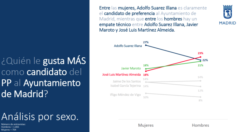 Suárez Illana es claramente el candidato preferido entre las mujeres con un 27% de apoyos, seguido de Maroto y Almeida (18% cada uno). Mientras, entre los hombres, se produce un empate técnico entre los tres principales aspirantes, con Almeida (23%) ligeramente por delante de Suárez Illana (22%) y Maroto (21%).