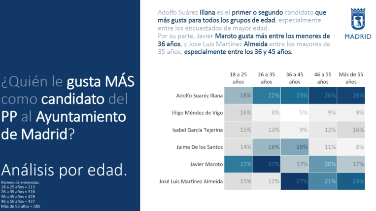 Los jóvenes de entre 26 a 35 años se deciden mayoritariamente por Maroto con un 27% de respaldo, mientras que Suárez Illana se sitúa como favorito entre los mayores de 45 años con un resultado del 26% de simpatizantes, dejando para Almeida el protagonismo entre los encuestados de 36 a 45 años. El 27% de este grupo de edad manifiesta su preferencia por el concejal.