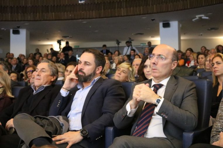 Jaime Mayor Oreja, Paloma Adrados, José Luis Martínez Almeida, José María Álvarez del Manzano, entre diputados, concejales y otras autoridades de la derecha madrileña actual. De la futura, flanqueando a Santiago Abascal estaban Carlos Urquijo, ex delegado del Gobierno en el País Vasco y el periodista Herman Tersch. Tersch, por cierto, estaba a la derecha de Abascal.