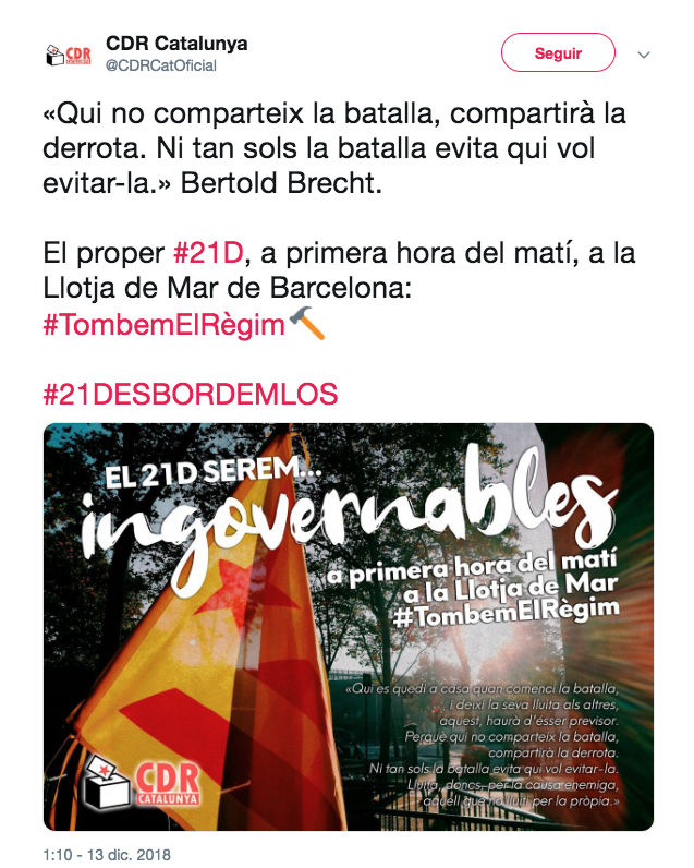 A través de su cuenta de Twitter, estos comités han bautizado la movilización con el lema “el #21D serem ingovernables”. En estos mensajes, llaman a tomar las calles, organizar la respuesta y preparar la resistencia. Uno de los hashtag bajo los que organizan la movilización en esta red social es #TombemElRègim.