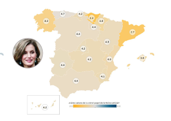Por Comunidades Autónomas, la que mejor puntúa a la Reina es Asturias, donde roza el aprobado con 4,7 puntos. Le siguen con 4,4 varias regiones: Andalucía, Extremadura, Castilla y León y La Rioja.