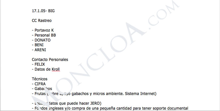 Otro documento llamado “Gestibig” también está relacionado con el control de las comunicaciones (intervención de teléfonos), CC en los acrónimos que usaba el equipo de Villarejo. Encabezado por “17.1.05 BIG” y “CC Rastreo”, aparece toda una relación de personas: