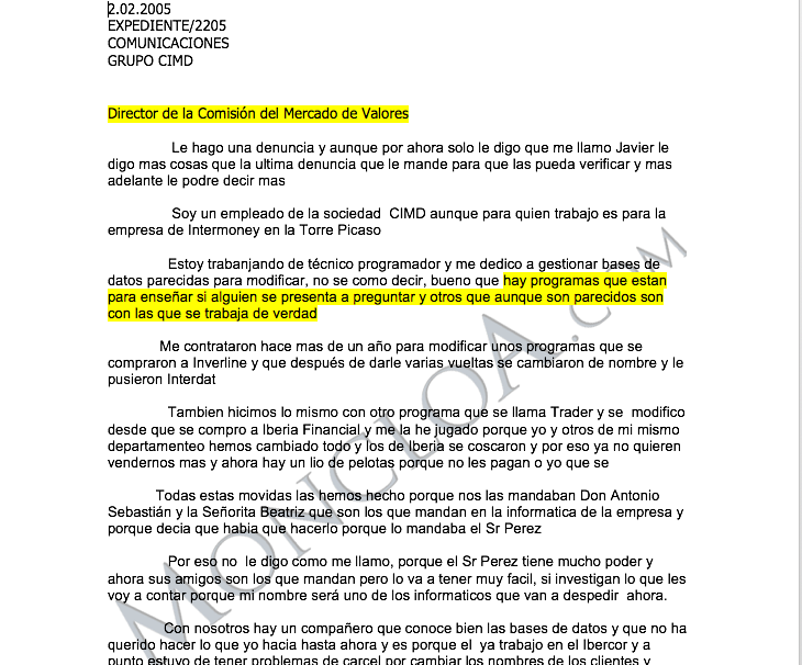 Villarejo elaboró varias versiones de un escrito dirigido a la Comisión Nacional del Mercado de Valores (CNMV) en febrero de 2005. En este documento, el empleado de Intermoney habría informado de presuntas irregularidades en esta empresa. El escrito relata que el programador se dedica a gestionar bases de datos y que “hay programas que están para enseñar si alguien se presenta a preguntar y otras que aunque son parecidos, son con las que se trabaja de verdad”.