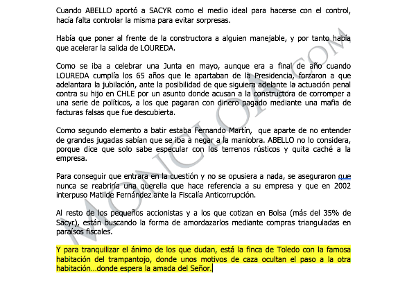 Los párrafos que contiene desgranan lo que parece una relación de detalles delicados que podrían poner al descubierto sobre la operación de control sobre el BBVA. Entre ellos, como colofón, estaba el siguiente párrafo: “Y para tranquilizar el ánimo de los que dudan, está la finca de Toledo con la famosa habitación del trampantojo, donde unos motivos de caza ocultan el paso a la otra habitación…donde espera la amada del Señor”.