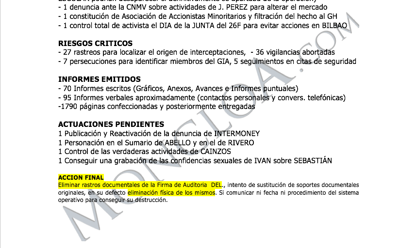 Un mes más tarde, el 30 de marzo, rehace su contenido, vuelve a la denominación «Proyecto Trampa», el nombre que llevó toda la operación para desestabilizar la operación de asalto al BBVA por parte de la constructora Sacyr y sus aliados. Aquí hace desaparecer la confesión de la destrucción de documentos. En su lugar, advierte que, por motivos de seguridad, no todas las acciones quedan reflejadas, y certifica que el objetivo se ha «cumplido totalmente». La sucesión de los informes y el cambio de párrafos se condensan en la siguiente imagen: