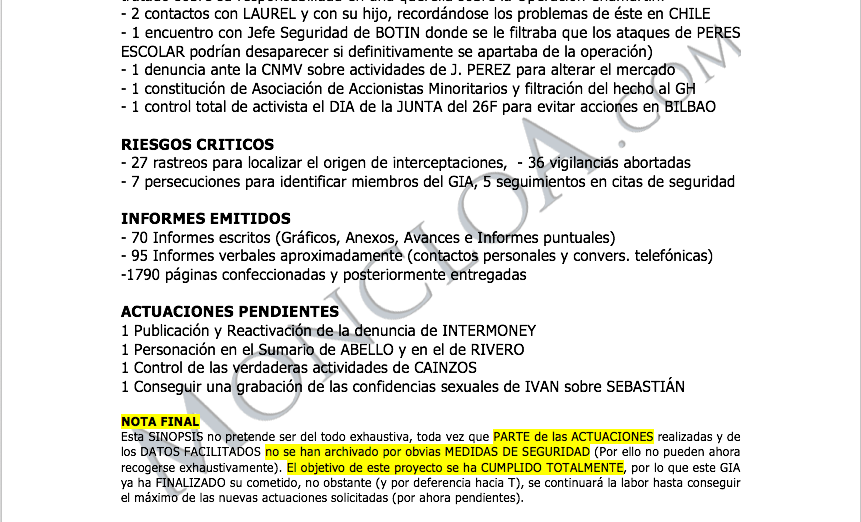Entre los documentos publicados ya hace un mes por MONCLOA.COM se encontraba una sinopsis en la que aparecía un misterioso párrafo (pinche aquí para leer el documento) que, por sí sólo, no indicaba más que Villarejo había realizado acciones secretas de las que ni siquiera quería hacer referencia en los documentos presentados al banco. En principio, no parecía posible conocer a qué acciones se refería.