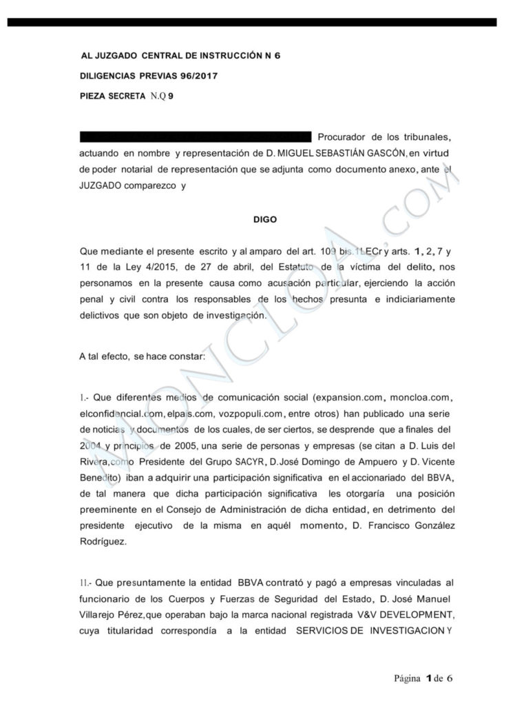 La acusación se fundamenta en las informaciones difundidas por diversos medios de comunicación «en relación con las operaciones de espionaje y vigilancia realizadas por grupos operativos coordinados por el entonces comisario de policía José Manuel Villarejo, cuyos servicios habrían sido contratados en el año 2004 por responsables del BBVA con el fin de favorecer los intereses económicos del Francisco González Rodríguez, entonces, Presidente Ejecutivo de la entidad», se indica en una nota de prensa de CCS Abogados, el bufete que representa a Sebastián en esta causa.