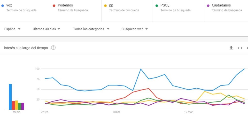 A poco más de un mes para las elecciones generales del 28-A, los políticos de las cinco fuerzas quieren acaparar la atención de los medios. Es el caso de Vox, que desde que consiguió sus mejores resultados en las pasadas andaluzas, no ha dejado de estar en los primeros puestos de búsqueda en Internet.