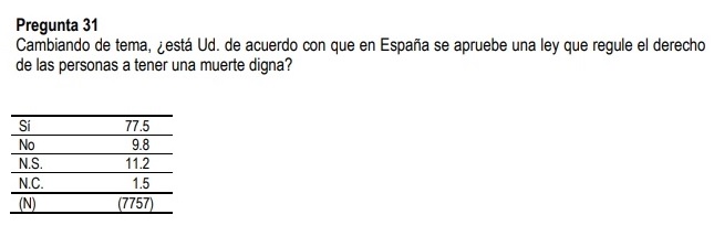 Sin embargo, éstos hicieron referencia al citado barómetro del CIS de 2011 que preguntaba sobre “la muerte digna”. En realidad, el último estudio en el que el organismo incluyó la palabra “eutanasia” se remonta a mayo de 2009. En la investigación titulada ‘Atención a pacientes con enfermedad terminal’, un 58,4% de los encuestados afirmó “con toda seguridad” que debería regularse en España la ley de la eutanasia.