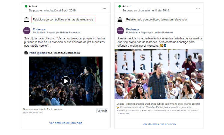 Este mecanismo obliga a los partidos políticos a identificarse como tal antes del 15 de abril, si no quieren que sus mensajes electorales sean eliminados. Asimismo, se indicará qué publicaciones son publicidad, como se ha hecho hasta ahora, pero se añadirá “pagado por…” para dejar claro quién ha sido el encargado de la financiación de dicho post. “Si un anunciante indica que su anuncio está relacionado con política o temas de relevancia nacional, se le exigirá que especifique quién lo ha financiado”, señala Facebook.