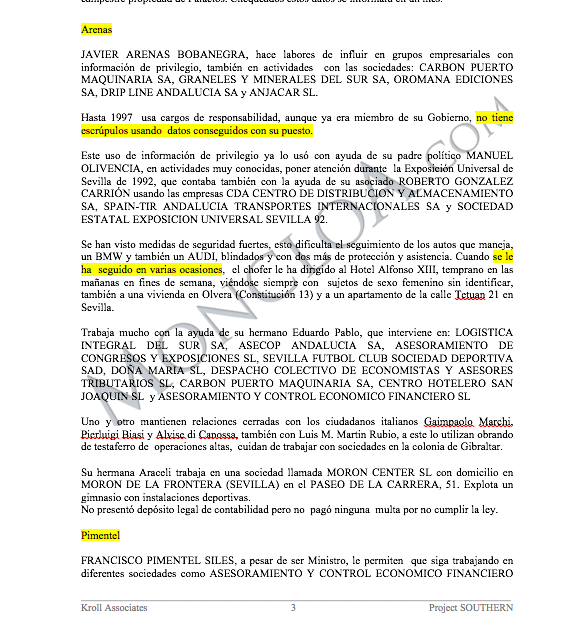 Según este documento, Arenas fue objeto de seguimientos personales, puesto que se hace referencia a “medidas de seguridad fuertes” por lo que “dificulta el seguimiento de los autos que maneja”. Estos eran un BMW y un Audi blindados, más otros dos de protección y asistencia. En el informe se da cuenta de cómo su chófer le lleva al hotel Alfonso XIII “temprano en las mañanas en fines de semana, viéndose siempre con sujetos de sexo femenino sin identificar”. También hace referencia a una vivienda y un apartamento.