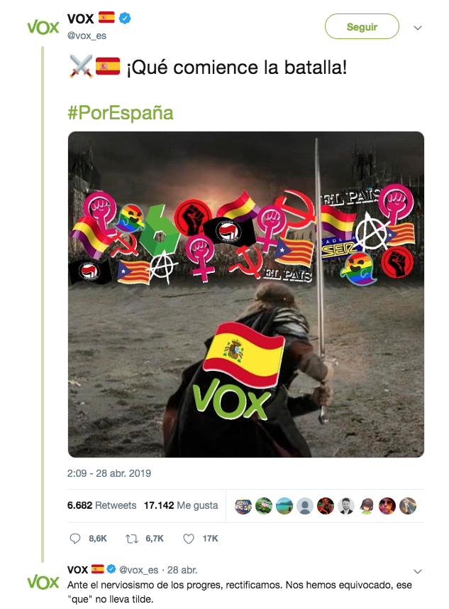 Tras las exitosas elecciones autonómicas andaluzas y las decepcionantes generales para este partido, el modus operandi de Vox con respecto a los acontecimientos bélicos no ha cesado. Esto ha sido así incluso en las contiendas ficticias, pues los verdes volvieron a generar polémica en Twitter con un meme de El Señor de los Anillos, en el que se observa a Aragorn —con un emoticono de la rojigualda sobre su espalda— haciendo frente a una legión de enemigos simbolizados con banderas independentistas, logos feministas, comunistas, anarquistas o antifascistas.