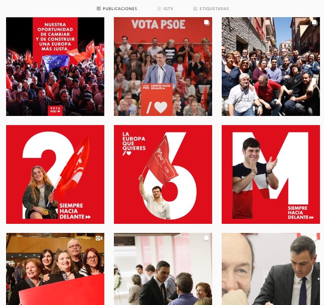 A diferencia del PP, el PSOE se ha decantado más por la subida de fotos y vídeos con los mensajes promocionales de la campaña, bajo los lemas “La Europa Que Quieres” o “Siempre Hacia Delante”. Tan solo dos publicaciones se corresponden con actos: uno celebrado en Madrid, con la presencia de Ángel Gabilondo, candidato a la presidencia de la Comunidad de Madrid, y Pepu Hernández, candidato a la Alcaldía de Madrid; y otro en Zaragoza, con la presencia de Javier Lambán, candidato a la presidencia del Gobierno de Aragón, y Pilar Alegría, candidata a la alcaldía de Zaragoza.