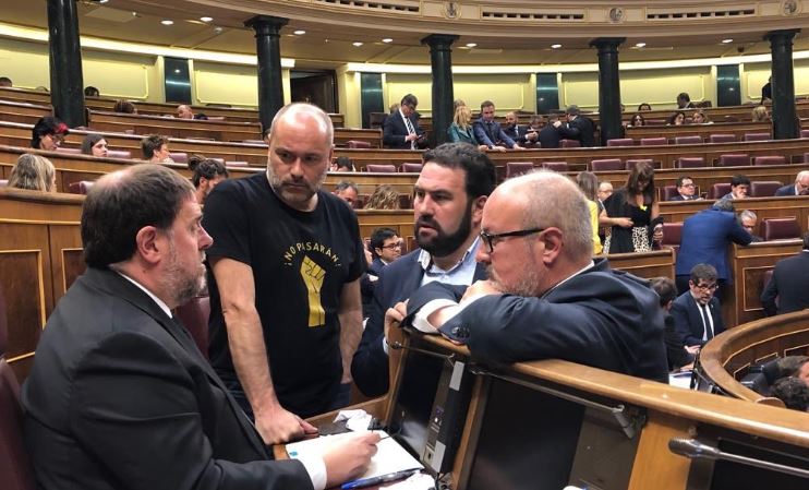 Este comportamiento es frecuente en las filas de ERC. Gabriel Rufián, acostumbrado siempre a dar espectáculo, es uno de los firmes promotores de estas reivindicaciones. Cuando encarcelaron a los ‘Jordis’ compareció en el Congreso con una prenda de manga corta con la imagen de los susodichos alzando el puño; otra que lució fue sobre la mítica frase de Rodrigo Rato “Es el mercado, amigo”, pronunciada por el exvicepresidente y de Bankia el pasado enero de 2018 en su despedida de la Cámara Baja o con la imagen de la misma persona entre rejas. Ayer, sin embargo, acudió a la constitución de las Cortes con una discreta americana negra (aunque con una chapa amarilla sobre la solapa) y una camisa de color blanco.