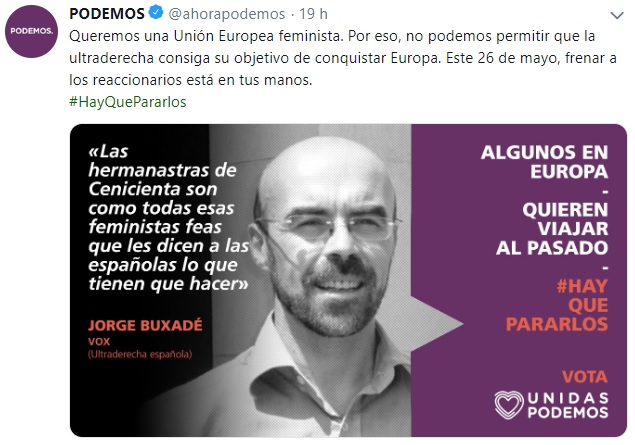 “Algunos en Europa quieren viajar al pasado. #HayQuePararlos” es el lema utilizado en estas imágenes por Podemos para decantar su voto a su formación, lema que aparece acompañado con frases dichas, supuestamente, por cada uno de estos políticos. “Queremos una Unión Europea feminista. Por eso, no podemos permitir que la ultraderecha consiga su objetivo de conquistar Europa. Este 26 de mayo, frenar a los reaccionarios está en tus manos”, señalaba Podemos en uno de los tuits junto con la imagen de Jorge Buxadé, candidato de Vox para las elecciones europeas.