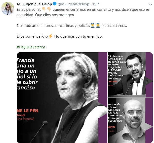 El pasado jueves 23 de mayo, en la red social twitter, varios miembros de Podemos, como Pablo Iglesias, Sofía Castañón, Isabel Serra, María Eugenia Rodríguez Palop, Dina Bousselham, Noelia Vera e incluso la propia cuenta del partido político, subieron diferentes tuits con imágenes de políticos de otras formaciones. Albert Rivera, de Ciudadanos; Jorge Buxadé y Javier Ortega Smith, de Vox; o Marine Le Pen, Matteo Salvini y Janusz Korwin-Mikke, a nivel europeo, han sido principalmente los rostros más utilizados por Podemos, bajo el hastag “#HayQuePararlos”.