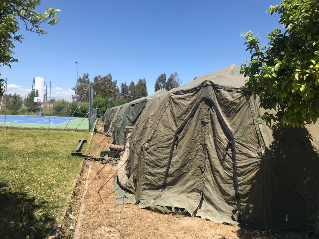 El campamento montado por los ingenieros del Ejército en El Copero –una base de helicópteros cercana a Sevilla– está solo destinado a tropa y cabos. A partir de sargento, oficiales y desde luego mandos, están en residencias más dignas, al menos con cama y baños.