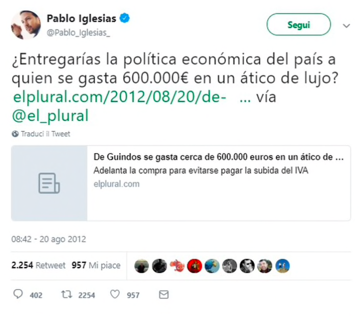 Hace algunos años, Pablo Iglesias criticó a De Guindos por comprarse un ático de lujo por un precio de 600.000 euros. Pablo no veía nada bien que alguien se gastase ese dinero de forma ‘innecesaria’. Los seguidores de Podemos apoyaron este tuit del líder de la formación morada. Pero parece que unos años después tuvo que tragarse sus propias palabras.