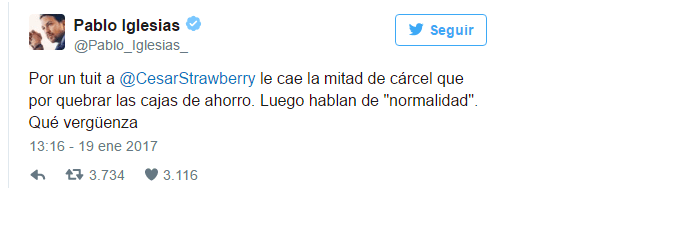 Pablo Iglesias, e Íñigo Errejón, no dudaron en defender los tuits de César Strawberry y calificar de vergonzoso el hecho de que tuviese una pena de un año de cárcel.»Por un tuit a @CesarStrawberry le cae la mitad de cárcel que por quebrar las cajas de ahorro. Luego hablan de «normalidad». Qué vergüenza»».