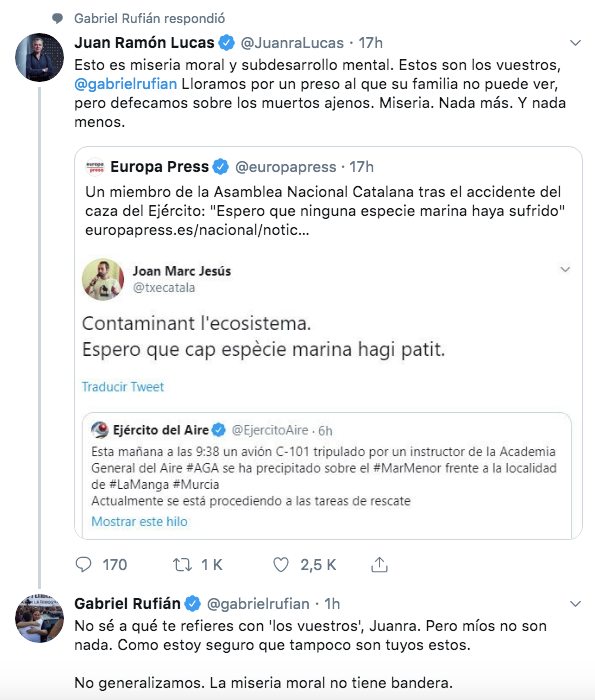 El trágico accidente aéreo en el que ha fallecido el comandante del Ejército del Aire Francisco Marín Núñez ha sacado a relucir numerosos comentarios en las redes. Algunos de ellos tan lamentables, que incluso los políticos y los periodistas se han hecho eco de ellos. Un insultante tuit de un independentista se ha convertido en un arma arrojadiza entre muchos usuarios de Twitter. Tanto, que incluso el periodista Juan Ramón Lucas lo ha utilizado para criticar al portavoz de ERC en el Congreso, Gabriel Rufián. Y el diputado no ha tardado en devolver el golpe.