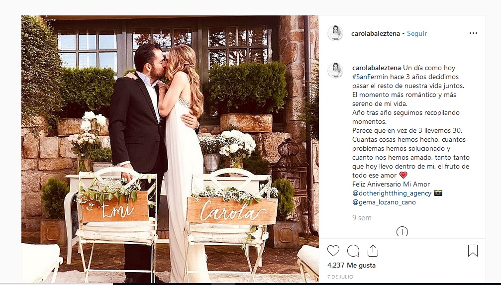 La exactriz, Carola Baleztena de 39 años y el hijo de la marca de joyas más grande de España, Emiliano Suárez, de 43, anunciaron el pasado mes de junio de 2019 que estaban esperando un bebé. La noticia fue una exclusiva de la revista Semana.