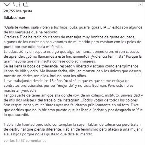 Abascal ha dicho que han logrado abrir los debates prohibidos como son la violencia de género, la inmigración o la independencia de Cataluña, cosa que ha hecho daño colateral que Lidia Bedman sufra las consecuencias en sus redes sociales. La joven influencer ha denunciado las amenazas que está recibiendo en las redes. Entre todas, destaca una en la que la amenaza tanto a ella como a sus hijos: “Ojalá te violen a ti y a tus hijos”. Al día siguiente de que denunciase el acoso y las amenazas, la publicación tenía casi 48.500 likes y la mayoría de las revistas y medios se hacía eco de la noticia.