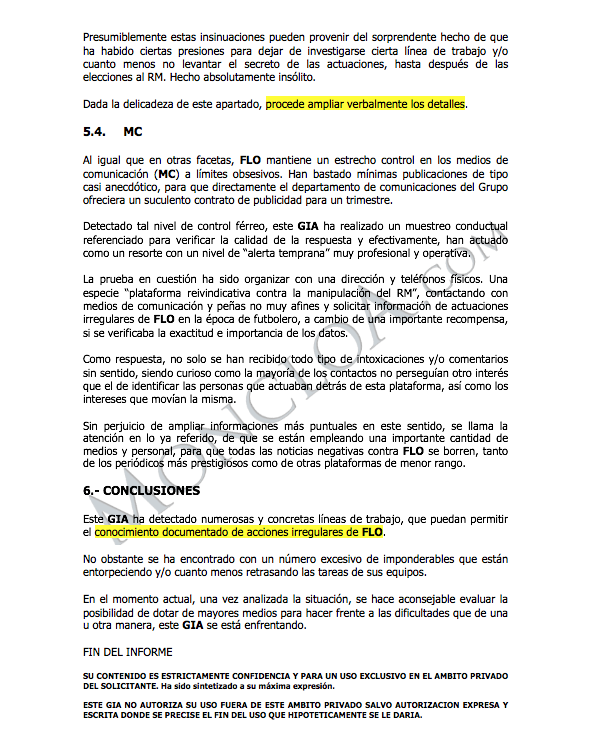 El comisario sostuvo en el informe entregado a Iberdrola que Florentino Pérez recibía apoyo “de casi todas las instituciones oficiales”. Incluso llegó a considerar “evidentes” las del Ministerio del Interior. Villarejo, que afirmó que recibió presiones para dejar de investigar, al menos hasta después de las elecciones a la presidencia del Real Madrid, consideró que “dada la delicadeza de este apartado, procede ampliar verbalmente los detalles”.