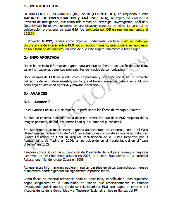 El “objetivo fundamental” del proyecto fue “verificar cualquier dato y/o circunstancia de interés sobre FLO y/o su equipo humano, que pudiera ser empleado en un escenario de conflicto, en caso de que este llegara finalmente a tener lugar”. FLO era la clave con la que los informes de Villarejo para Iberdrola se referían a Florentino Pérez.