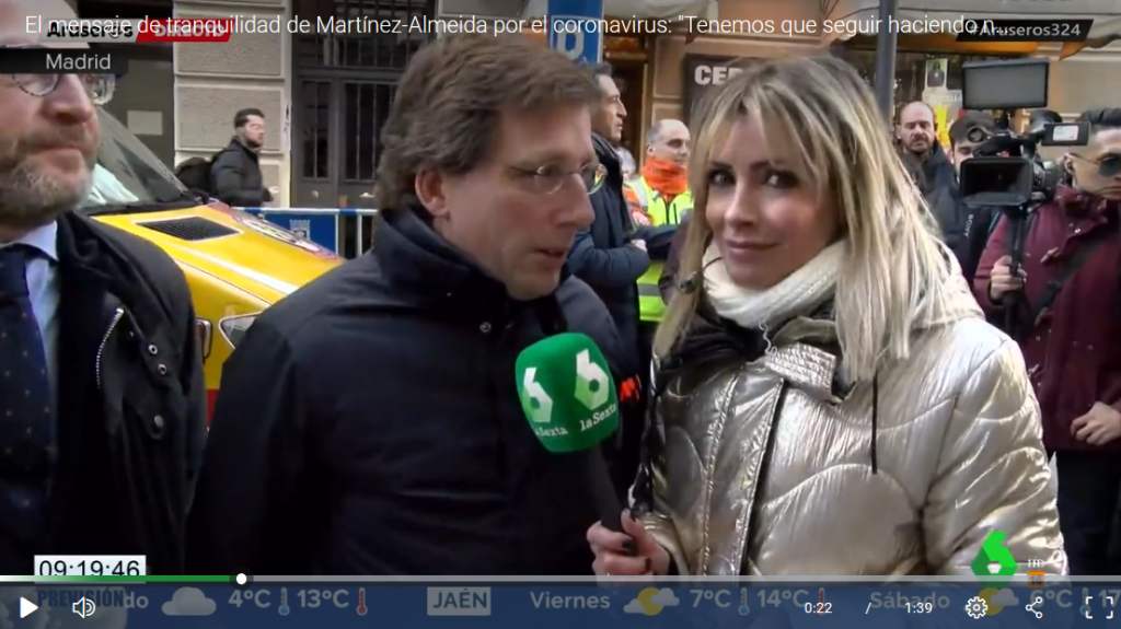 Desde el momento en el que Iñaki López inició la conexión con el alcalde, se vio que el entrevistado no sabía muy bien qué hacer con las manos, si sujetar el micrófono, si ponerlas sobre la camisa… El culmen fue el momento en el que Almeida apoya la mano sobre la barbilla.