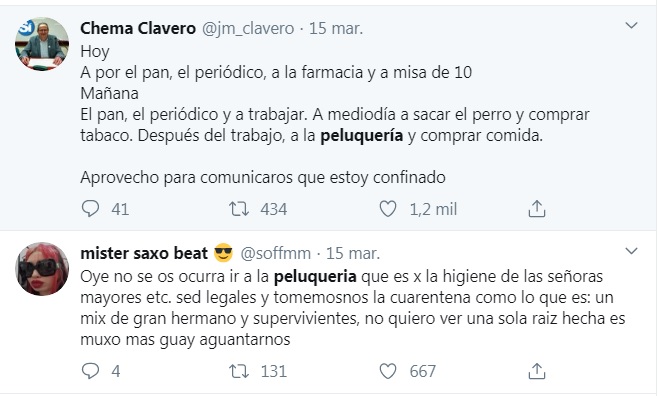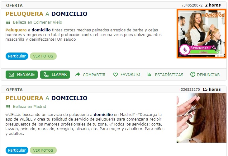 La primera es una peluquera particular que atiende en la zona de Colmenar Viejo, que suponemos que no le hace ninguna gracia tener que ira a casas ajenas, pero la necesidad de ingresos le puede más que el miedo al virus. La segunda, es una web que intermedia entre ciudadanos y peluqueros. En ella, tu dejas lo que necesitas el día que quieres que vayas y te mandan un peluquero.