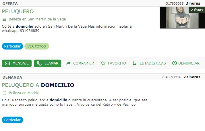 También se encuentran anuncios con demandas tan exóticas como «peluqueros marroquíes porque me gusta como lo hacen». Entendemos que los cortes de pelo.Los del barrio del Pilar de Madrid también tenéis peluquero estáis de suerte no como los de Retiro y Pacífico y algunos se atreven hasta con las rastas: » Hago rastas (técnica tradicional), Tintes, Tintes fantasía, Decoloraciones, Platinados ,Trenzas africanas, Degradados Cualquier consulta no dudes en decirme por whatsapp «, reza otro anuncio.
