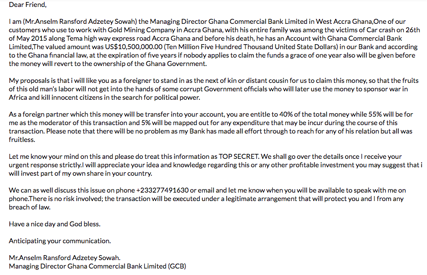 Este es el caso de un supuesto gerente de un banco de Ghana. Este banquero se pone en contacto contigo para explicarte que tú, como extranjero, has sido el elegido por él mismo para que recibas una herencia de una familia que murió en el año 2015. Según explica, en este país africano hay una ley que establece que a los cinco años de la muerte el dinero de una persona fallecida, si no es reclamado por nadie, se lo quedará el propio Estado.
