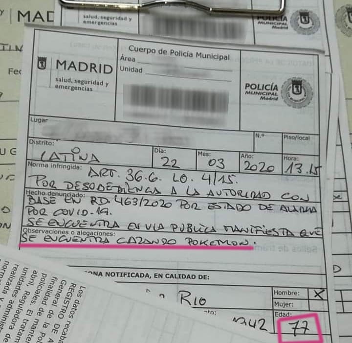 Pokémon es una serie japonesa de éxito de hace unos años. Marcó algunas generaciones, pero está visto que más de las esperadas. En la multa impuesta por la policía municipal se lee claramente: «Se encuentra en vía pública, manifiesta que está cazando pokémon». La imagen de la multa ha dado la vuelta a todas las redes sociales, que desde que se decretó esta situación excepcional, arden con más facilidad que otras veces.