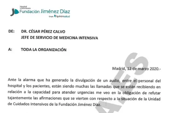 Otro audio muy inquietante es el de una supuesta trabajadora del hospital madrileño Fundación Jiménez Díaz (Madrid). En su narración, difundida antes de que se iniciase la cuarentena, nos explica el colapso del hospital porque está lleno de pacientes con coronavirus, que no nos están contando la realidad desde los medios, que no quedan respiradores y que si tienes un accidente o una enfermedad grave no vas a poder ingresar en la UCI. Nos cuenta además que no se trata solo de personas mayores, y habla de dos pacientes jóvenes ingresados, “que se van a morir”. En este audio de cuatro minutos también aporta algunas medidas de prevención que debemos tomar y asegura que próximamente se declarará un Estado de Sitio. Este mensaje fue desmentido y calificado como bulo, por el jefe de la UCI de dicho hospital. Además niega que los jóvenes ingresados tengan patologías relacionadas con el coronavirus.