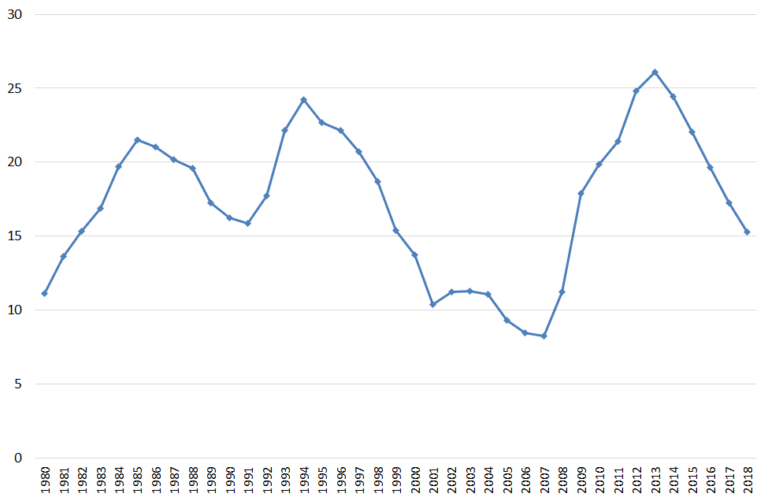 Esta gráfica del INE se ilustra la tasa de desempleo en España desde 1980 a 2018. Por ella han pasado dos gobiernos socialistas (Felipez González y José Luis Rodríguez Zapatero) y dos populares (José María Aznar y Mariano Rajoy).