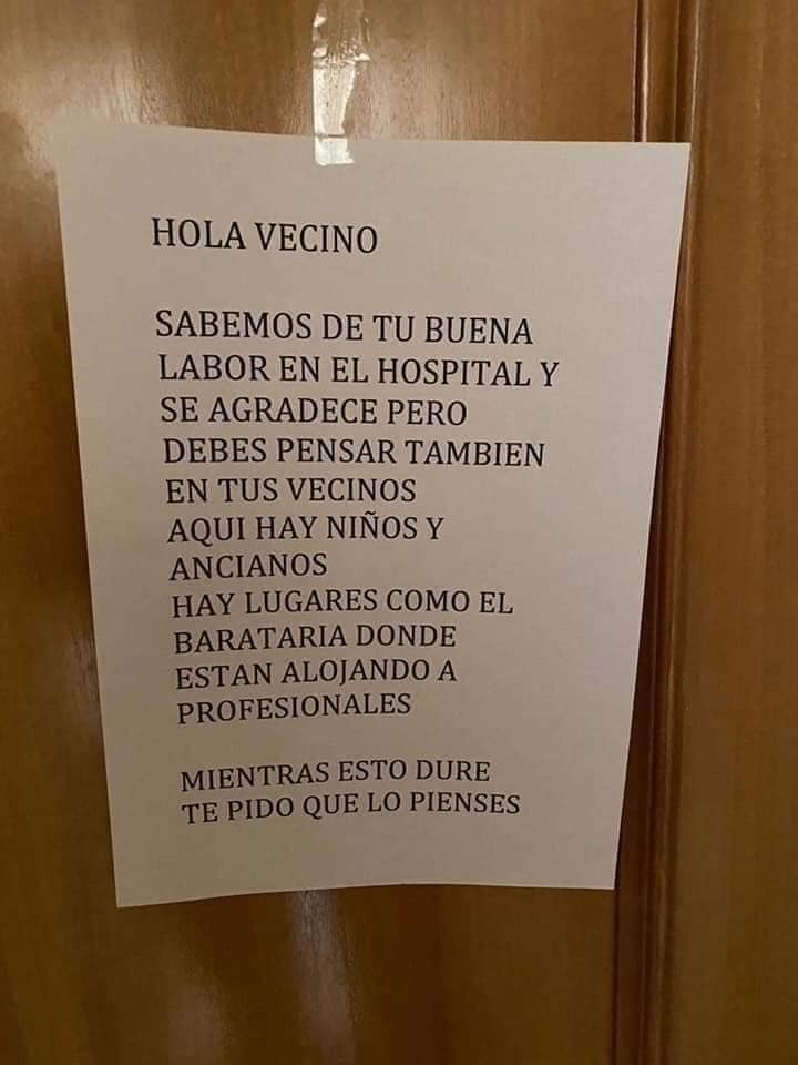 El caso anterior es muy radical, pero los hay miserables con educación. En este caso, un profesional se encontró en la puerta de su casa un cartel en el que sí, le aplaudía su labor durante estos días, pero le indicaba amablemente que había otros lugares en lo que podía quedarse mientras esto durara. Un detalle a tener en cuenta, el que sea educado, digo. Pero no solo los sanitarios, los cajeros también reciben acoso, como se ve en la siguiente imagen.