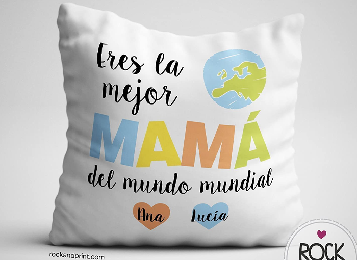 Para finalizar nuestro listado os traemos un regalo original para el Día de la Madre en forma de cojín personalizado. En este producto en particular aparece la frase «Eres la mejor Mamá del mundo mundial«.