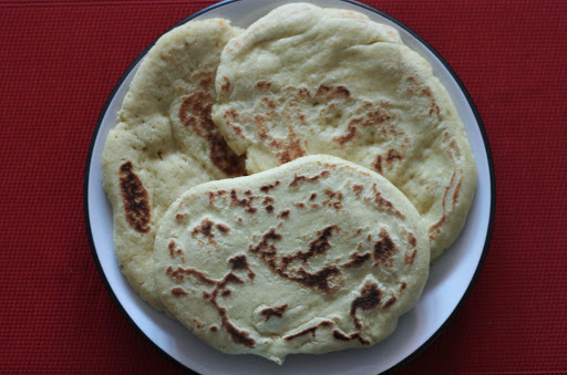 Mezcla la sal con la haria y añade poco a poco el agua. Tienes que amasar constantemente para conseguir una masa elástica que no se pegue. Haces una bola y la partes en tantas porciones como panes quieras sacar. Con estas cantidades tendrás para unas 6 raciones generosas. Deja que reposen unos 5 minutos mientra calientas la sartén.