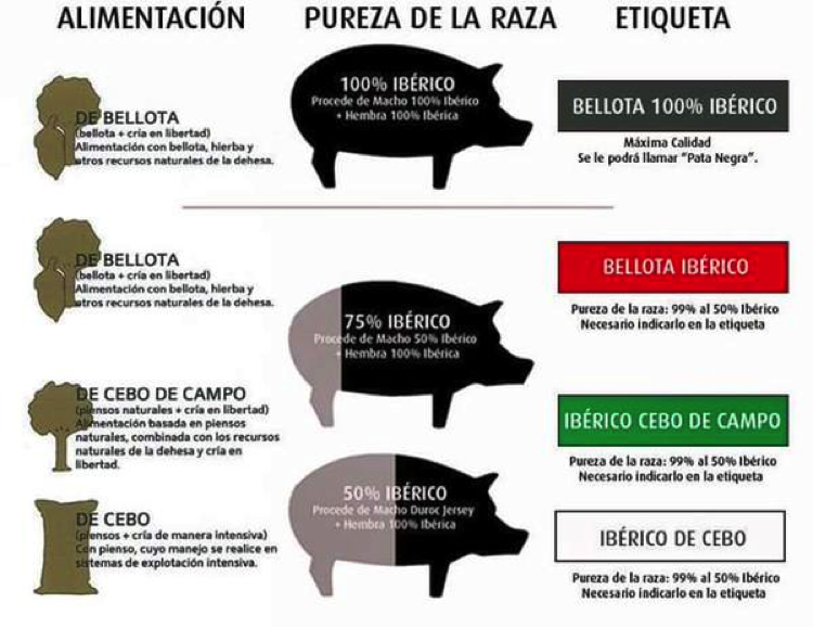 Es en lo primero que hay que fijarse para escoger bien un buen jamón ibérico como haría un experto. Por no todos lo son. Los hay también de cebo o de recebo. Es muy complicado saberlo por el paladar y menos aún por la apariencia. Habrá que ir directamente a la etiqueta porque la normativa obliga a especificar el tipo de jamón que es. La clave es la raza y el tipo de alimentación del cerdo: los de raza ibérica deben de provenir de padre y madre también 100% ibéricos o pata negra (etiqueta negra). Si no, será un 50% o un 75% dependiendo del caso (etiqueta roja). En cuanto a la alimentación, el cerdo puede haber comido bellotas (cría en dehesas, etiqueta negra), pasto, hierbas o pienso (el de recebo, etiqueta roja) o piensos de cereales y legumbres (de cebo, etiqueta blanca).