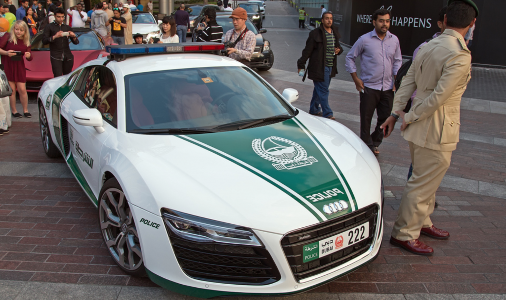 Hay algunos países donde los coches de hiperlujo circulan con más frecuencia que en otros. En Dubai, por ejemplo, u otras ciudades de países árabes la policía está dotada de unos vehículos exageradamente potentes. En este caso, se trata de un Audi R8 de más de 500 CV. Es un modelo usado por la Policía de Dubái en muchas de sus misiones en el emirato, y acelera de 0 a 100 kilómetros por hora en cuatro segundos.