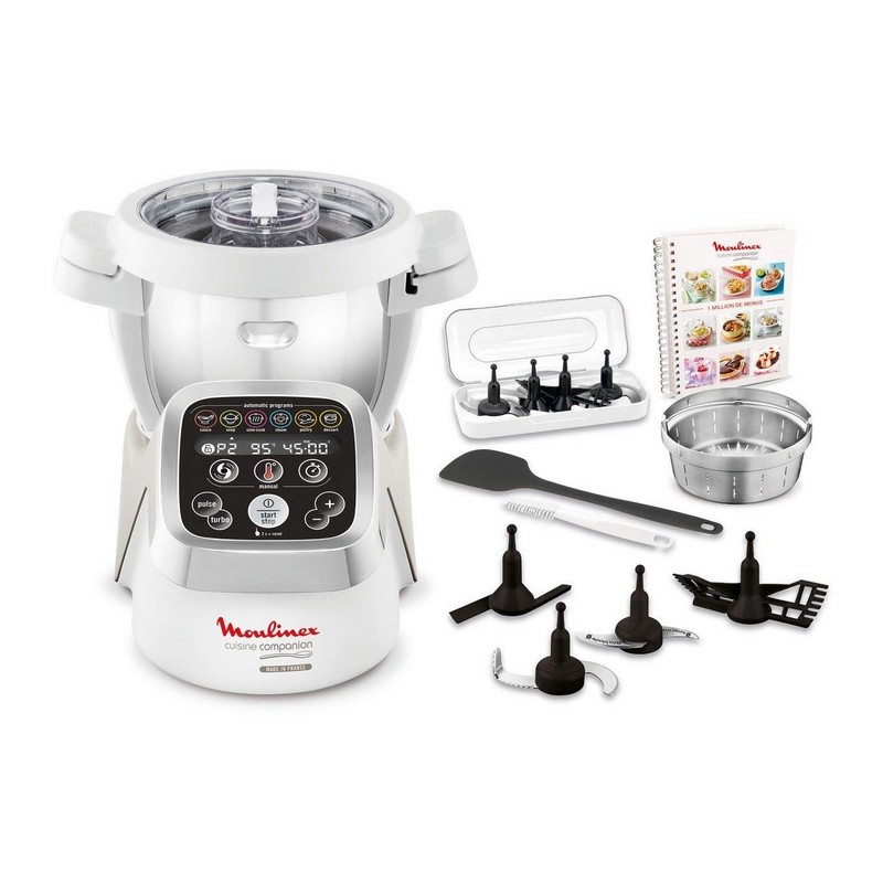 Añade funciones muy solicitadas como la báscula de hasta 5kg y la función de girar a la izquierda. Hace de todo: cuece al vapor, mezcla, bate y amasa, pica, tritura, sofríe, emulsiona y remueve. Además viene con un montón de utensilios: accesorio cocedor, cuchilla, báscula de cocina integrada, recipiente mezclador de acero inoxidable (2,2 l), accesorio mezclador, tapa con cobertura de llenado y vaso medidor, espátula, una vaporera con tapa y una vaporera plana para cocer al vapor.