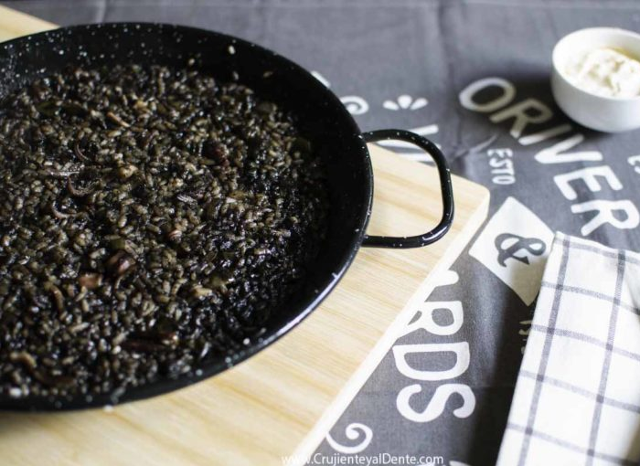 Esta receta es un plato tradicional del Levante español. Es de tiupo paella y adquiere el color negro de la tinta de calamar.