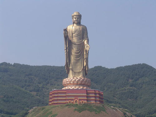 No hay más que ver las imágenes de la estatua más grande de Buda que se conoce para comprender lo impactante que debe ser la visión de la figura para los millones de visitantes que acuden cada año para rezar en el templo. 128 metros de alto. 1000 toneladas de estatua hecha en cobre que coronan uno de los templos budista de la provincia china de Henan. Como idea del tamaño, la Estatua de la Libertad no le llega ni al pedestal sobre el que se asienta.
