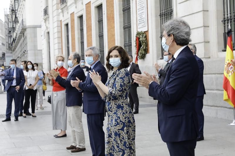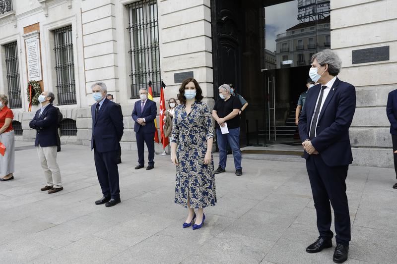 Posteriormente, al mediodía, todos han secundado desde la Puerta del Sol, frente a la Real Casa de Correos, el minuto de silencio que desde el pasado 30 de marzo se guarda en la Comunidad de Madrid en memoria a las víctimas del coronavirus.