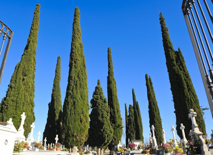 Una de las características más llamativas de los cementerios es la apuesta por el ciprés como árbol representativo. Estos se encuentran principalmente en las necrópolis de los países mediterráneos, aunque también se emplean en otros lugares por todo el mundo.