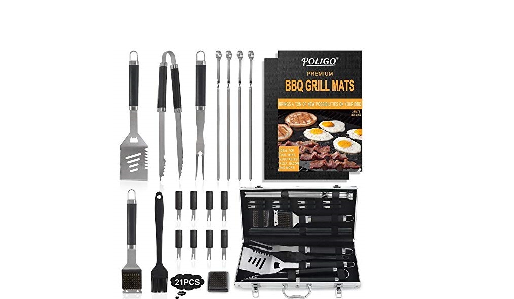 Este cuarto kit que presentamos tiene 21 piezas de la marca POLIGO para realizar deliciosas barbacoas. Destaca por sus resistentes accesorios para cocinar la carne y para la degustación. Asimismo, los utensilios para cocinar, cuentan con mangos prolongados para proteger las manos del calor. Un kit que tiene buena aceptación por parte de los usuarios.